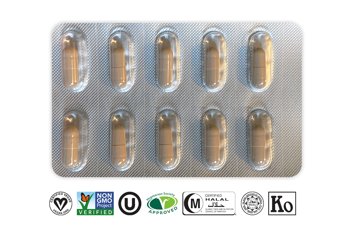 タピオカ(キャッサバ芋)を原料とした100%植物由来のカプセルです。その信頼性は高く、ヴィーガン・ハラール・コーシャーなど多くの認証を受けています。